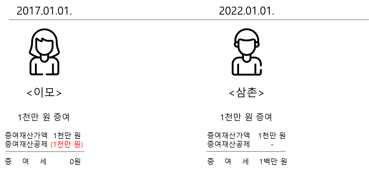 따라서 위 사례에서는 2017년 이모에게 증여받는 때에 기타친족 증여재산공제 1천만 원을 모두 적용받은 상태입니다. 이 때 10년이 지나기 전 동일한 그룹(기타친족)인 삼촌으로부터 1천만 원을 증여받는다면, 삼촌에게 받은 1천만 원은 증여재산공제를 적용받을 수 없습니다.