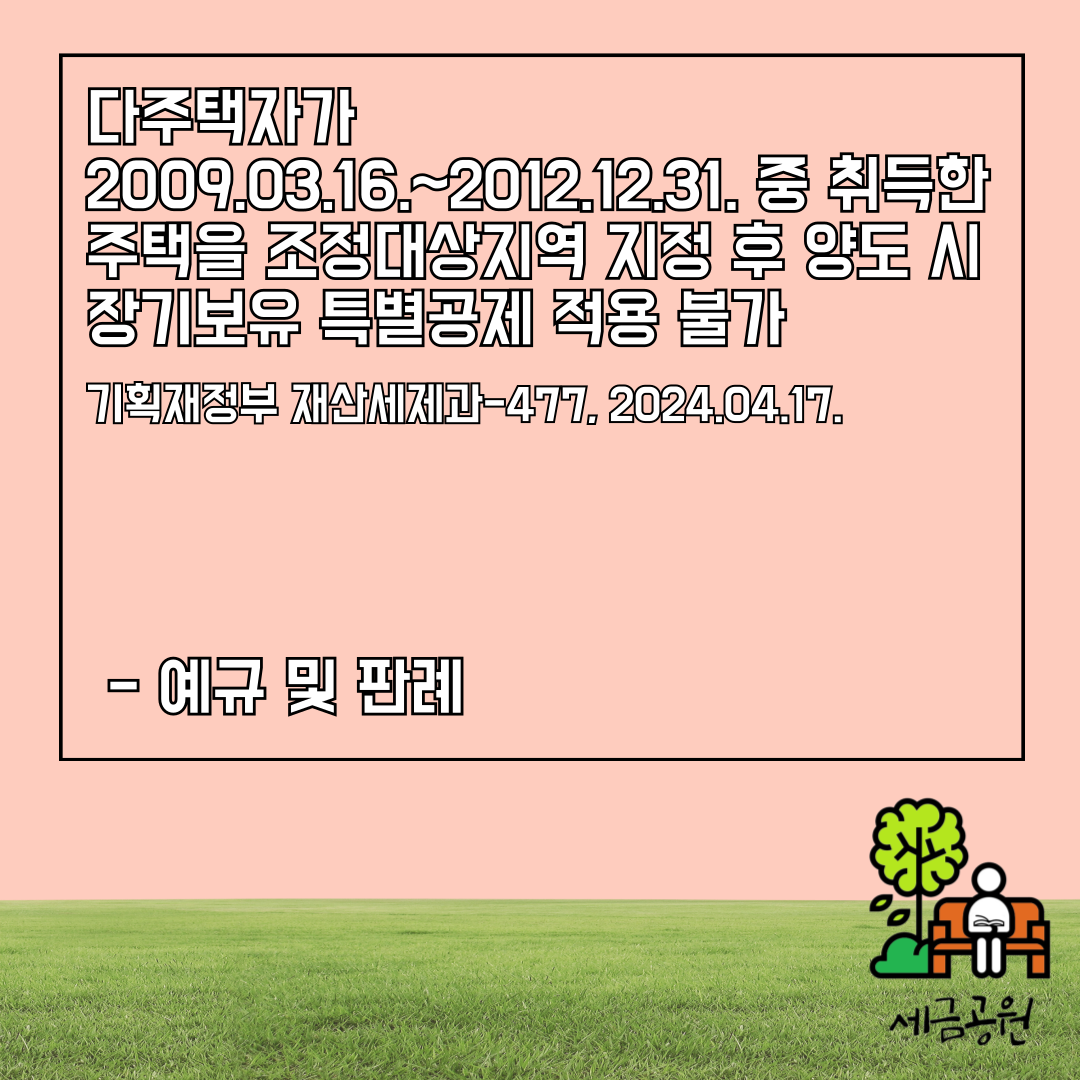 다주택자가 2009.03.16.~2012.12.31. 중 취득한 주택을 조정대상지역 지정 후 양도 시 장기보유 특별공제 적용 불가(기획재정부 재산세제과-477, 2024.04.17.)