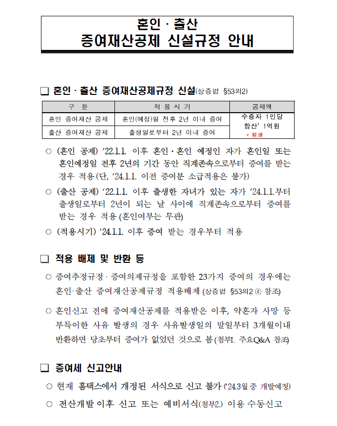 작년 여름 세법 개정안에서 처음 언급되고, 2024년 신설되어 적용되는 상속세및증여세법 §53의2 【혼인ㆍ출산 증여재산 공제】 에 대해 포스팅하고자 합니다.