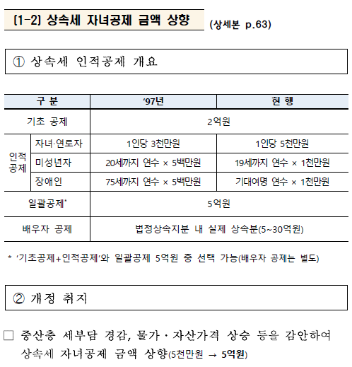 개정안이 나오기 전까지 일괄공제와 배우자상속공제를 상향하는 방안을 주로 다루었기 때문에 얼마나 상향될지가 화두였는데, 실제 개정안에 발표된 내용은 자녀공제금액을 1인당 5억 원으로 상향하는 내용이었습니다.