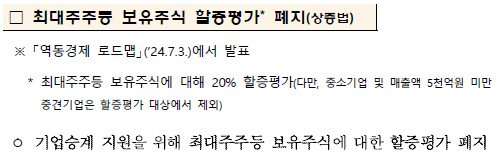 이 제도 때문에 故이건희 삼성그룹 전 회장 상속세가 12조 원이 나오고, 故김정주 넥슨 창업자 상속세가 6조 원이 발생해 기획재정부가 넥슨의 2대 주주가 되는 등 오너家 상속에서 문제가 있었지요. 이 제도를 폐지하자는 개정안이 발표되었습니다.