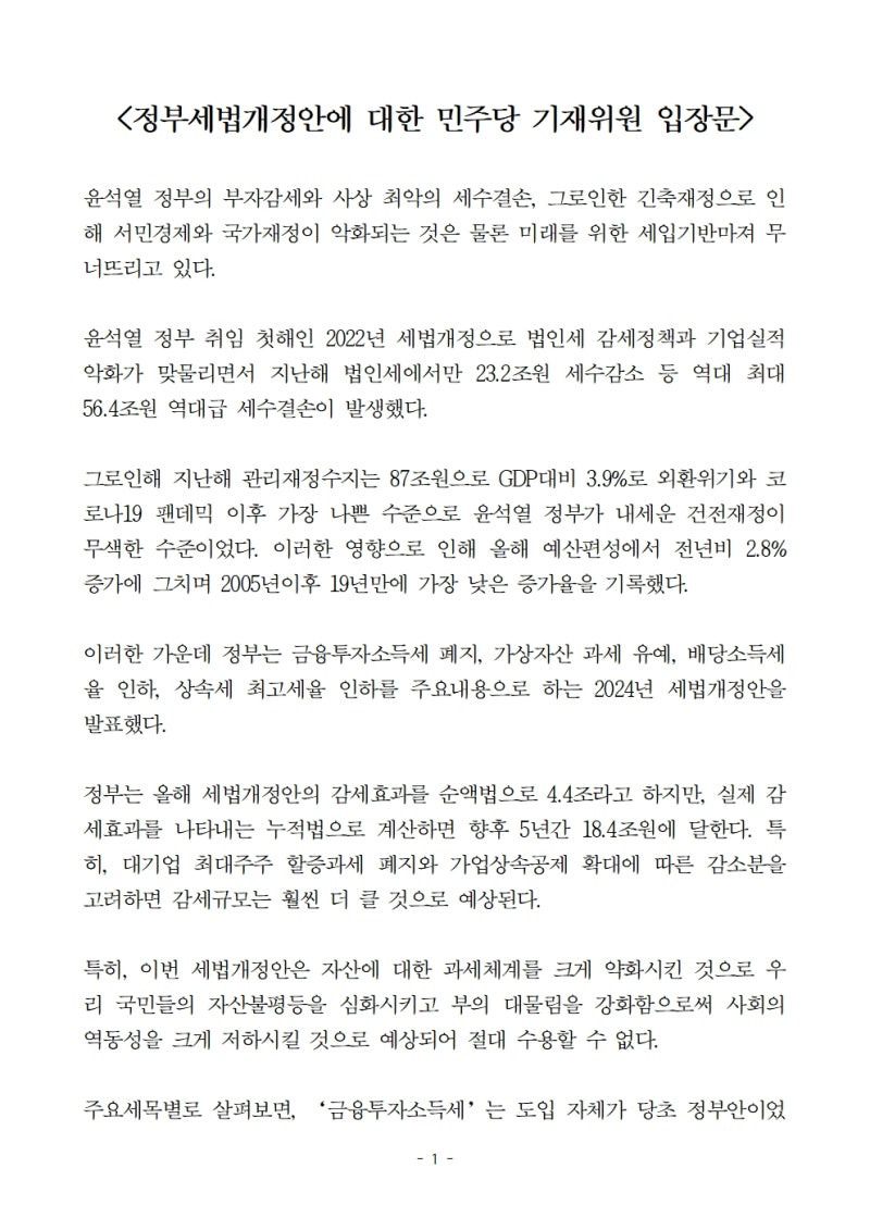 이번 세법 개정안과 관련하여 야당은 상속세 최고세율 인하, 최대주주 할증 폐지, 자녀공제금액 확대 등 상속세 개편안 전반에 대해 반대하는 입장이 있습니다. 여당과 기재부는 최선을 다해 설득하겠다는 입장이지만, 많은 뉴스 기사는 세법 개정안 내용에서 수정이 불가피할 것으로 예상하고 있습니다.