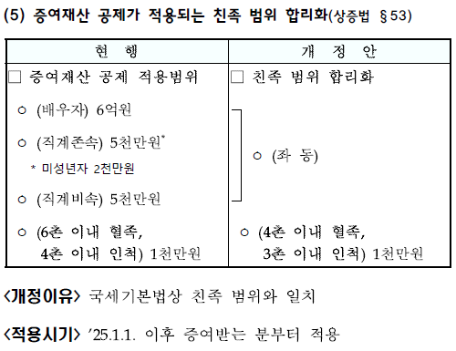 증여재산 공제가 적용되는 친족 범위를 국세기본법의 범위와 일치시키는 개정안입니다.