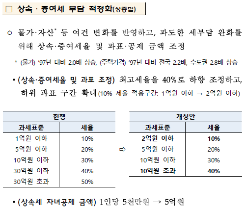 이번 세법 개정안에는 10% 과세표준 구간을 1억 원 이하에서 2억 원 이하로 상향 조정하고, 50% 세율을 삭제하는 개정안이 나왔습니다.