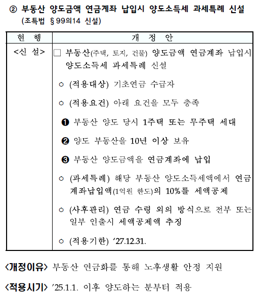 기초연금 수급자로서 (1) 부동산 양도 당시 1주택 또는 무주택 세대이고, (2) 양도 부동산을 10년 이상 보유하였고, (3) 부동산 양도금액을 연금계좌에 납입(1억 원 한도)하여 연금 형태로 수령하는 경우에는 해당 부동산 양도소득세에서 연금계좌 납입액의 10%를 세액공제받을 수 있게 됩니다. 적용기한은 2027.12.31. 까지입니다.