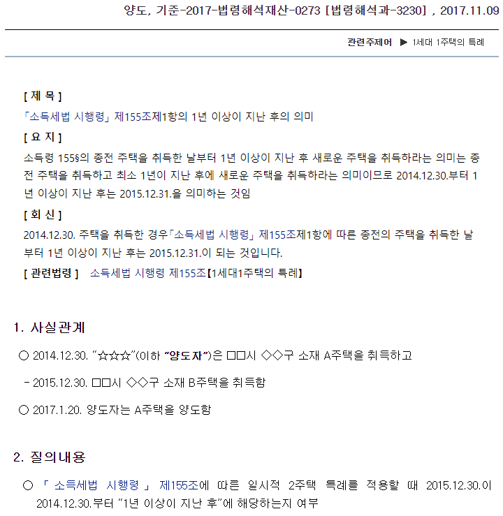 세법의 기간 계산은 별도의 언급이 없는 한, 민법에 따라 계산합니다. 민법에서는 초일불산입 원칙을 따르고 있습니다. 따라서 2014.12.30. 부터 1년이 지난 날은 2015.12.30.이 되는 것이고, 지난 후라 함은 그 다음날인 2015.12.31. 을 의미하기에 예규의 사례에서는 1년이 지난 후에 취득한 상황에 해당하지 않습니다.
