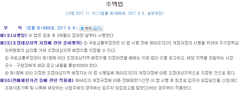 단, 1세대1주택 비과세 거주요건을 판단하고자 하시는 분이라면 국토교통부 공고가 2017.09.06. 이고, 개정 주택법 시행일이 2017.11.10.일 지라도 소득세법 시행령 154조 2항에 2017.08.03.~11.09. 사이 기간에 대해 고시문과 같은 지역을 언급하고 있으므로, 2017.08.03. 이후 취득 주택에 대해 적용하시면 되겠습니다.