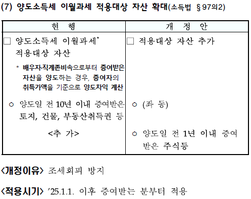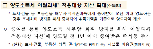 현행법 상 배우자 등 이월과세 규정은 ①토지와 건물, ②부동산을 취득할 수 있는 권리, ③이용권·회원권을 증여하는 경우에만 적용되는 규정이었습니다. 여기에 양도일 전 1년 이내 증여받은 주식 등을 추가하는 개정안입니다.