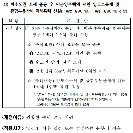 2) 비수도권 소재 준공 후 미분양주택에 대한 양도소득세 및 종합부동산세 과세특례 신설(조특법 §98의9, 조특령 §98의8 신설)