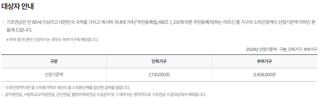 기초연금이란, 만 65세 이상이고 대한민국 국적을 갖고 있으며 국내에 거주하는 어르신 중 가구의 소득인정액이 일정금액(2004년 기준, 단독가구 213만 원, 부부가구 340.8만 원) 이하인 분들이 수령하실 수 있는 연금입니다.